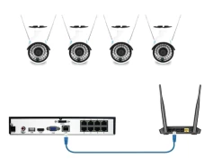 Voorwaarde bij deze set is dat de NVR op de router aangesloten zit, die ook je WiFi netwerk huist. De camera’s en de NVR moeten namelijk aangesloten zijn op hetzelfde netwerk. Je sluit eerst de NVR aan op je router met een Ethernetkabel. Daarna installeer je de camera’s met behulp van de app. Tip: je kunt de camera eerst bedraad aansluiten op je router, om de installatie te versnellen. Zijn alle camera’s aan je WiFi gekoppeld en is de NVR op de router aangesloten? Dan kan de NVR je camera’s vinden in het netwerk. Vervolgens voer je het wachtwoord in van de camera’s op de NVR (deze heb je eerder in de app aangemaakt).